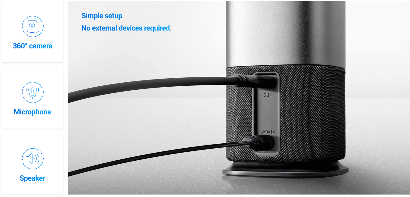 Thiết bị hỗ trợ kết nối qua cổng USB Type-C và nguồn DC 12V, giúp người dùng dễ dàng cài đặt và sử dụng. Phần mềm Panocam hỗ trợ cài đặt hình ảnh và điều khiển từ xa, giúp tối ưu hóa chất lượng hình ảnh và âm thanh trong các cuộc họp. Người dùng có thể dễ dàng quản lý thiết bị và cấu hình camera theo nhu cầu.