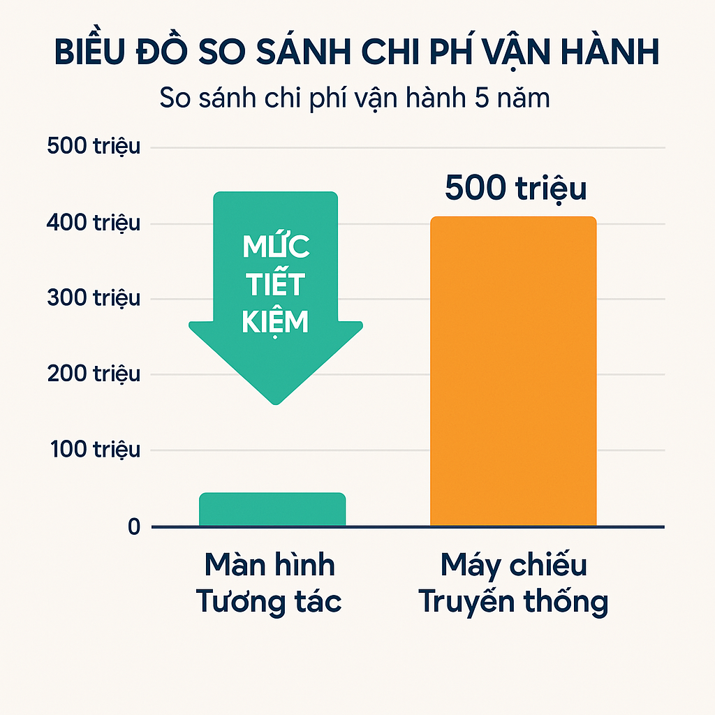 Một trường học ở TP.HCM đã báo cáo tiết kiệm hơn 45 triệu đồng/năm cho chi phí giấy, mực in và bảo trì máy chiếu sau khi trang bị màn hình tương tác cho 10 lớp học (ví dụ minh họa dựa trên phân tích chi phí thực tế).